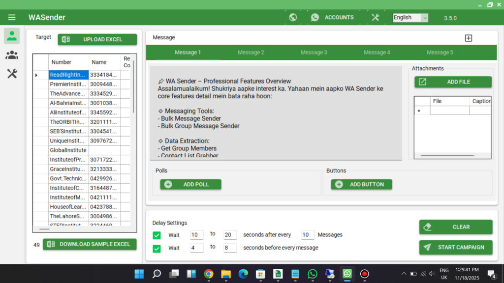 WaSender Home page where you can add bulk number, write upto 5 messages, attach files, set timer, add pool etc.